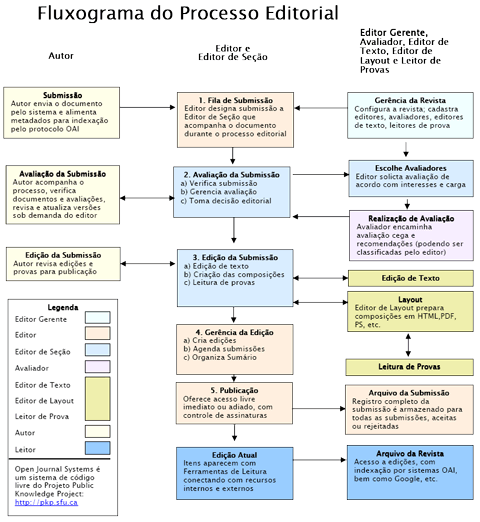 O sistema controla e movimenta submissões à revista através de cinco passos no processo editorial, que serão gerenciados por um ou mais editores.